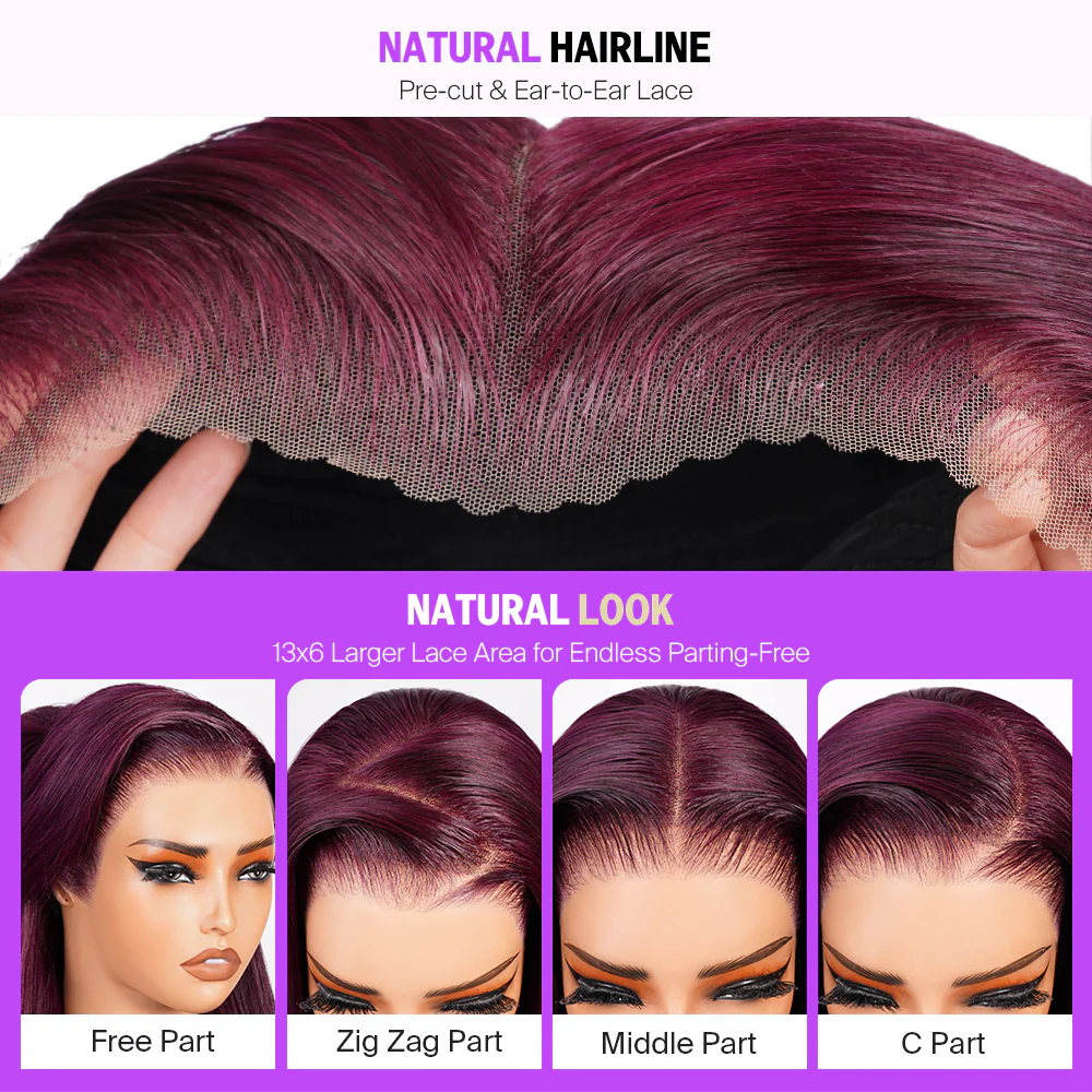 13×6 Three-Go™ Dark Plum Glueless Wigs Body Wave With Drawstring 100% Human Hair Wig